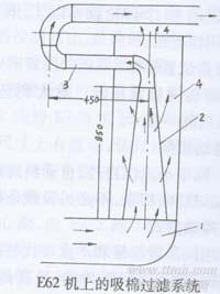 E62機上的吸棉過濾系統(tǒng)l—風(fēng)機排出的含塵空氣;2—錐形濾網(wǎng);3—纖維排