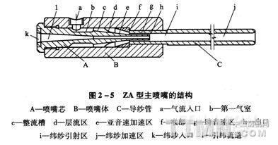 新型噴氣織機為了實現高速時的穩定引緯,加裝了輔助主噴嘴,輔助主噴嘴與主噴嘴構成串聯組合關系,可以縮短緯紗加速時間,從而為噴氣織機提高運行速度或拓寬筘幅創造了條件。2A型主噴嘴的結構見圖2—5。