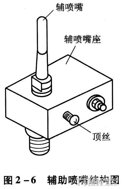 又稱接力噴嘴,簡稱輔噴嘴它向著緯紗行進方向的斜上方噴射氣流。輔助噴嘴結構圖見圖2—6。