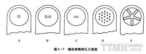 由于各種輔助噴嘴在其氣流進口處的管徑、管子長度、壓扁形狀、孔數及孔徑等都存在著差異,在供氣壓力相同的條件下,各種輔助噴嘴的出口風速不盡相同。在生產中,單孔和多孔都得到了廣泛的使用。日本津田駒系列采用單孔輔助噴嘴、豐田JA采用雙孔,而歐洲各國多采用多孔的輔助噴嘴。輔助噴嘴噴孔示意圖見圖2—7。