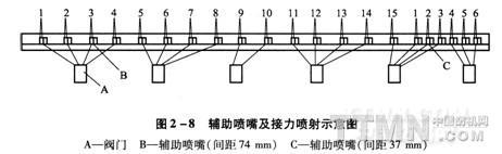 輔助噴嘴在筘座上的分布如圖2—8所示,一般情況下,輔助噴嘴以5個為一組,也有2個、3個或4個為一組,每組噴嘴受控于一個電磁閥。因此,同組幾個輔助噴嘴的開閉時間是一樣的。輔助噴嘴數與筘幅有關,各組噴嘴噴射時間互相銜接,各噴嘴間距通常為60—80 mm,標準設定80 mm。