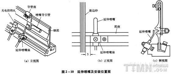 (4)延伸噴嘴:延伸噴嘴也叫牽伸噴嘴,安裝在最末一只輔助噴嘴之后,位于布幅之外。延伸噴嘴的結構與輔助噴嘴相似,供氣時間長,可牽引緯紗伸直。當主、輔噴嘴先后關閉后,延伸噴嘴仍繼續保證噴射,以免在綜平前緯紗反彈。用于防止緯紗反彈產生緯縮等,多用于緯紗為強捻長絲或包芯紗等場合。采用較高的氣壓會增加織機氣耗量(圖2—10)。