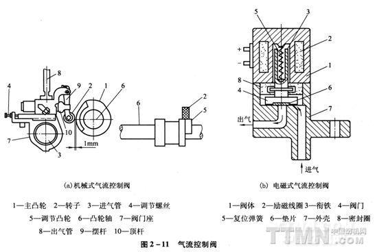 (1)機械式氣流控制閥[圖2一ll(a)]:最早用在噴氣織機上的氣流控制閥是機械閥,靠凸輪來完成氣流控制閥的開閉,沒有自調功能,調整不方便且易磨損、壽命短,目前在噴氣織機上已很少使用。