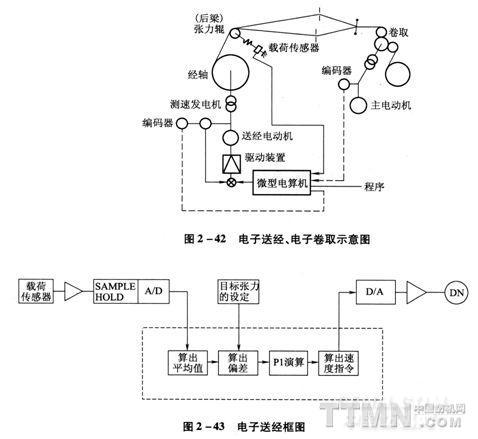 送經(jīng)控制單元負(fù)責(zé)檢測(cè)經(jīng)紗張力信號(hào)、計(jì)算經(jīng)軸直徑大小、按要求控制送經(jīng)伺服電動(dòng)機(jī)的轉(zhuǎn)速和轉(zhuǎn)向。根據(jù)織物對(duì)經(jīng)紗總張力的要求,在人機(jī)界面上設(shè)定經(jīng)紗張力目標(biāo)值、經(jīng)軸直徑的初始值和織物緯密。開機(jī)后送經(jīng)機(jī)構(gòu)按緯密對(duì)經(jīng)紗的需求量送出定量的經(jīng)紗,由與經(jīng)紗張力輥(后梁)連接的張力傳感器檢測(cè)經(jīng)紗的實(shí)際張力,由計(jì)算機(jī)對(duì)檢測(cè)的張力值處理后與設(shè)定值比較,通過PID演算來控制送經(jīng)伺服電動(dòng)機(jī)的動(dòng)作,達(dá)到恒張力送經(jīng)的目的。在恒張力送經(jīng)時(shí),可以隨時(shí)精確計(jì)算出經(jīng)軸直徑,將計(jì)算值替代初始值或前一計(jì)算值(圖2—42~圖2—43)。