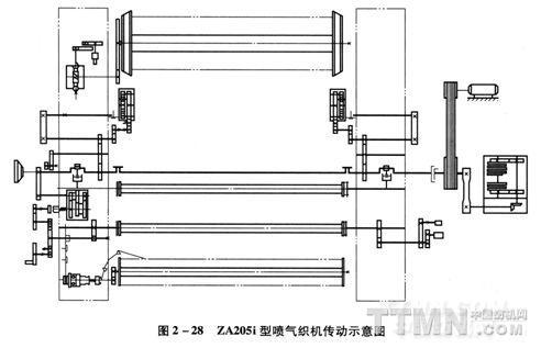 ZA200系列噴氣織機傳動系統:電動機通過三角帶將動力傳遞給織機主軸,主軸再傳遞給織機上的各個機構。織機在點動和自動尋緯期間的運動是通過5 Hz變頻電源驅動主電動機,然后主電動機再將動力傳遞給織機各個機構。