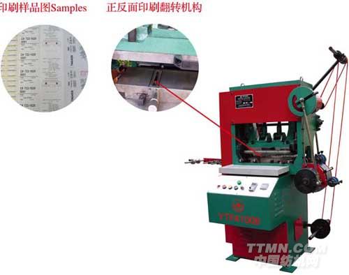 YTP4100B 專門用于布質(zhì)商標正反面同步印刷。機內(nèi)設有翻轉(zhuǎn)機構及烘干設備,但在正反面同步印刷時,由于來不及干燥,速度較慢,印速不能大于2500版/小時。