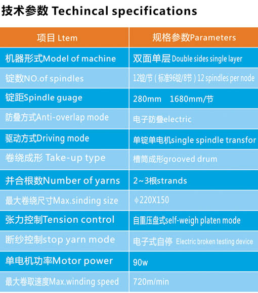 本產品可把2-3股棉、毛、麻、化纖及混紡紗線并合卷繞成并紗筒子,適用于倍捻機等前/ 道工序的加工.