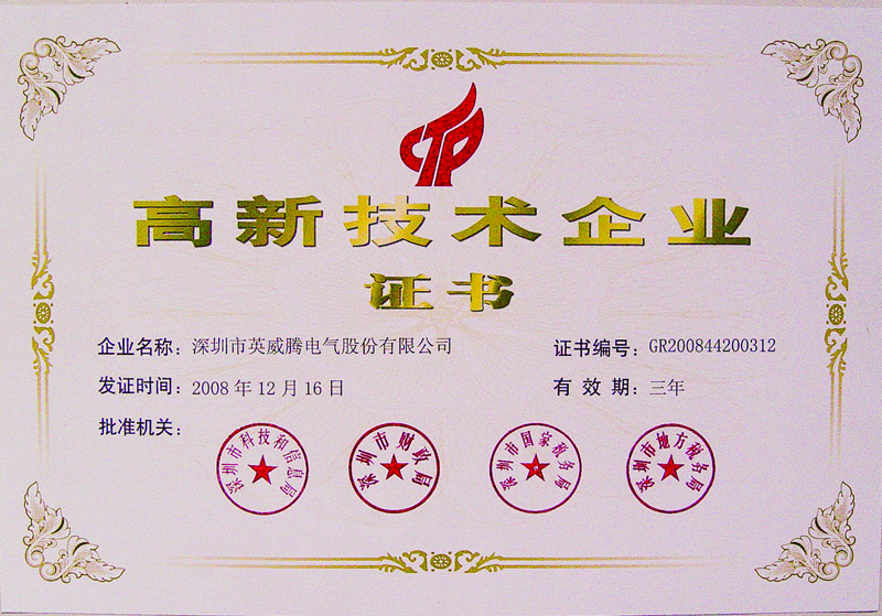 在國家重點(diǎn)支持的高新技術(shù)領(lǐng)域,持續(xù)進(jìn)行研究開發(fā)與技術(shù)成果轉(zhuǎn)化,形成企業(yè)核心自主知識產(chǎn)權(quán),并以此為基礎(chǔ)開展經(jīng)營活動,重大高新技術(shù)成果轉(zhuǎn)化項(xiàng)目的技術(shù)水平屬于國內(nèi)領(lǐng)先或國際先進(jìn)的企業(yè),經(jīng)企業(yè)報(bào)審?fù)ㄟ^后,才能被認(rèn)定為“國家級高新技術(shù)企業(yè)”。國家對高科技自主研發(fā)的發(fā)展高度重視,在2008年科技部、財(cái)政部、國家稅務(wù)總局聯(lián)合下發(fā)新的《高新技術(shù)企業(yè)認(rèn)定管理辦法》中,提高了國家級高新技術(shù)企業(yè)認(rèn)定的標(biāo)準(zhǔn)和門檻,對企業(yè)擁有核心技術(shù)的自主知識產(chǎn)權(quán)、員工素質(zhì)和企業(yè)贏利這幾方面來作為硬指標(biāo)。能夠被認(rèn)定為“國家級高新技術(shù)企業(yè)”是一個企業(yè)科技實(shí)力和科技水平的綜合體現(xiàn),英威騰能達(dá)到要求的高標(biāo)準(zhǔn)、通過認(rèn)證,充分證明了英威騰的高科技領(lǐng)先水平及企業(yè)的綜合實(shí)力。