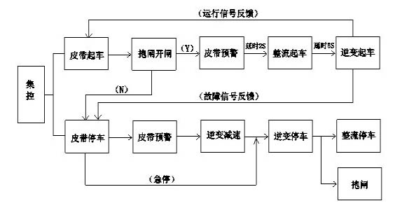 3、整流與逆變的起、停車順序,啟動時集控系統先給整流器起車信號,整流起車后延時5s給出逆變起車信號,逆變起車;停車時,逆變減速到0Hz,運行繼電器輸出信號停止后整流停車。