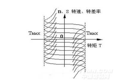 電機正轉,電機的輸出轉矩通過減速機轉換后作用在皮帶機的驅動輪轂上,并與上層皮帶自重沿傳輸面重力分量作用在皮帶機驅動輪轂上的 力矩組合,電機工作在第一象限。當皮帶上煤后,煤的重量沿皮帶傳輸方向的分力也作用在驅動輪轂上,并使驅動力矩逐漸增大,當驅動力矩超過摩擦力力矩后,驅動輪轂的轉速將加速轉動,通過機械連接使得電機轉子也加速轉動,其速度超過電機的同步轉速;此時電機處于反轉再生狀態,電機工作在第二象限。當電機反轉時,則工作在第二、四象限。