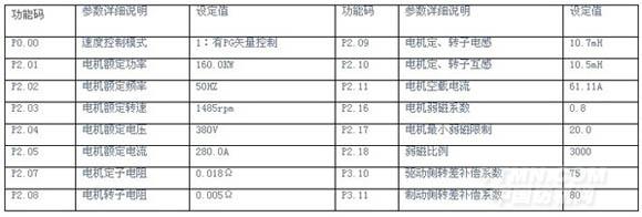 辨識電機參數在電機軸與負載脫開的情況下進行,首先設定電機參數P2.00-P2.05和編碼器參數P4.00-P4.01,然后設定 P0.07為1進行電機參數自學習,主要的參數如下: