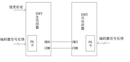 主變頻器的速度反饋通過高速脈沖輸出口(HDO)輸出,作為從變頻器的速度給定。HDO的輸出頻率范圍:0~50KHz,精度可達到0.1Hz。