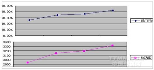 通過對上述數據中總功率和擋板平均開度之間關系的變化趨勢分析,可以看出風門擋板開度和總功率之間略呈線形關系。如下圖所示: