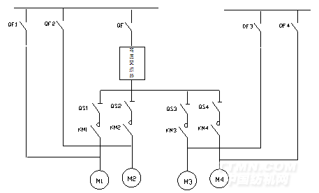 ③隔離開關、真空接觸器以及高壓斷路器之間的閉鎖關系KM1 與KM 4電氣互鎖;KM1 與KM3,電氣互鎖;KM2 與KM3 電氣互鎖;KM2與KM4,電氣互鎖;控制同一臺電機的高壓斷路器和真空接觸器同時只允許一個閉合,如QF閉合,則KM1 不允許合閘,KM 1合閘,則QF 不允許合閘。