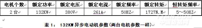 1、客戶提供的電機參數見表1。變頻器需控制兩臺132KW異步電機的同時啟停控制。給變頻器控制命令有:正轉啟動,反轉啟動,多段速指令,正轉點動,反轉點動,故障復位;