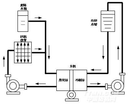 該部分由冷卻泵、冷卻水管道、冷卻水塔及冷凝器等組成。冷凍水循環(huán)系統(tǒng)進行室內(nèi)熱交換的同時,必將帶走室內(nèi)大量的熱能。該熱能通過主機內(nèi)的冷媒傳遞給冷卻水,使冷卻水溫度升高。冷卻泵將升溫后的冷卻水壓入冷卻水塔(出水),使之與大氣進行熱交換,降低溫度后再送回主機冷凝器(回水)。