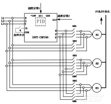 分別在主機蒸發(fā)器回水處、冷凝器出水及回水處安裝溫度傳感器,實時檢測管網(wǎng)的溫度,以模擬信號(0~10V或者4~20mA)反饋給變頻器,通過變頻器內(nèi)置的PID運算輸出相應的頻率指令后自動調(diào)節(jié)水泵轉速,從而調(diào)節(jié)各循環(huán)水的熱交換速度,最終實現(xiàn)對室內(nèi)恒溫度的控制。需要特別說明的是,變頻器內(nèi)部在設計上集成了溫差反饋處理功能,系統(tǒng)無須另配專用控制模塊。
