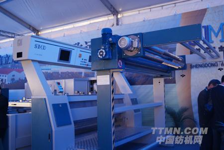 石:我們主要帶來了藍翔2010倍捻機,這個產品現在我們做了一些改進,假捻機最主要的是多了一個假捻器和一個熱箱。這個假捻器是我們自己生產的,為了讓客戶以后維修帶來方便。熱箱這邊是我們控制系統增加了一個報警功能,和一個溫度自動補償功能。這一點市場上原有的廠家里面我們是獨創的首先第一家。其他的像剎車的話也是重新設計,然后皮帶盤后面,機尾上面也是多加了一個皮帶盤。為了我們以后的機器更加容易省電,還有增加絨帶的壽命。然后我們的主電機就從別人的第一代產品從11kW,減到了7.5kw。我們的整體機身比原先的機身下降了14公分。為了便于我們客戶那邊招工方便。就是這些優勢。