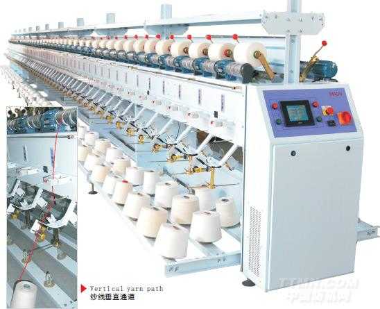 該機采用電機直驅槽筒導紗,并紗股數 2 股或 3 股,采用電子式程序控制防重疊,最大卷繞速度 800m/min,具有光電式斷紗檢測裝置和單錠定長功能。