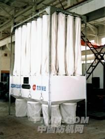 車間含塵空氣通過風(fēng)機(jī)送入靜壓箱內(nèi),由于風(fēng)速急劇下降,大部分纖維塵雜自然落入集塵袋內(nèi),小部分粉塵隨空氣吸附在過濾袋上,通過振蕩機(jī)構(gòu)定時(shí)振蕩,也落入集塵袋內(nèi)。