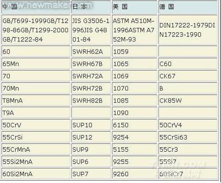 合金彈簧鋼一般含0.45%~0.70%的碳和一定量的Si,Mn,Cr,V,W及B等合金元素。合金元素的加入改善彈簧鋼的抗松弛性能,提高鋼的韌性,同時顯著提高鋼的淬透性和使用溫度,適用于制造較大截面,較高溫度下使用的彈簧。國內外彈簧鋼常用牌號對照如表1。
