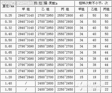 該標準是冷拉碳素彈簧鋼絲的通用標準,主要用于制作在各種應力狀態下工作的靜態彈簧。根據彈簧工作應力狀態鋼絲可分三個級別供貨:B級用于低應力彈簧,C級用于中等應力彈簧,D級用于高應力彈簧。成品鋼絲考核抗拉強度、扭轉、纏繞和彎曲四項性能,常見規格的力學性能如表4。