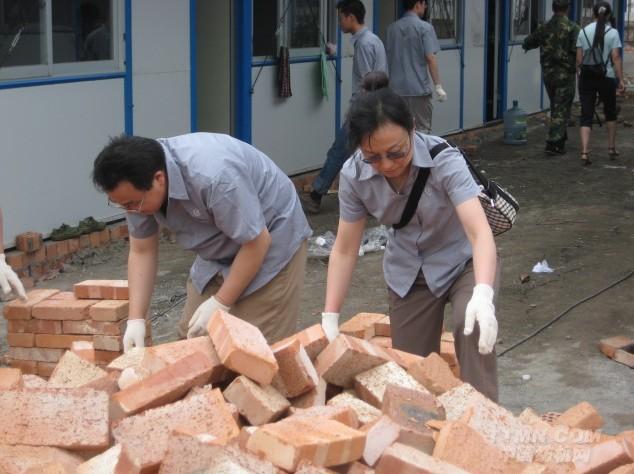 離開小漁洞,車隊(duì)來到通濟(jì)鎮(zhèn),看望慰問了成華區(qū)人武部救災(zāi)指揮駐地的官兵,并在當(dāng)?shù)亟M織開展黨員實(shí)踐活動,以實(shí)際行動支援災(zāi)區(qū)的家園重建。六十多名志愿者分成幾個小組,分別負(fù)責(zé)對臨時安置活動板房施工現(xiàn)場的安裝材料進(jìn)行歸類和場地清理工作,有的手抬肩扛,運(yùn)渣土,抬磚塊,有的拿起鋤頭,鐵鍬等工具平整房間地面,組成愛心接力,將厚厚的隔墻板等裝修材料傳遞到指定位置。對臟和累,大家毫無怨言,只想能盡快搭建起溫暖的家園。中午,為了不給災(zāi)區(qū)增添負(fù)擔(dān),參加活動的志愿者個個自帶干糧,站在停靠車隊(duì)的馬路邊匆匆吃完午飯,顧不上休息,又繼續(xù)投入施工現(xiàn)場進(jìn)行清理。