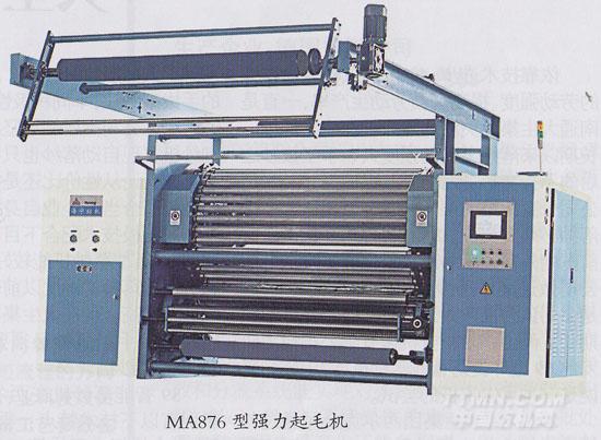 MA876型強力起毛機專用于不倒絨、超柔絨、緯編革基布、經緯編麂皮絨、短毛絨等對起毛力要求高的織物起毛。該機機電一體化程度高,采用人機界面、PLC、變頻器實現全機傳動,特別是起毛力實時檢測和控制技術的應用,真正達到了工藝的再現性:針輥傳動三角帶輪的支承方式采用專利技術的卸荷式結構,改善了軸頭的受力情況,徹底解決了軸頭斷裂問題;采用旋轉可調包角式擴幅輥(專利技術),對不同織物可調節不同包角大小,多種走布路線還可以調節對織物正面、反而的不同擴幅要求,達到更好的擴幅效果:有糾偏歸中,缺布自停,翻布部件、靜電消除等多種多種選用部件,可減少操作員工配置,提升效率。