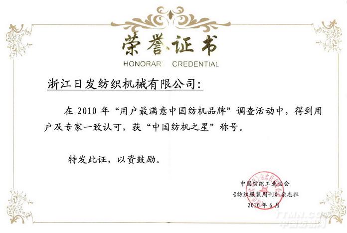 《紡織服裝周刊》主辦的2010年 “中國紡機之星”用戶最滿意品牌調(diào)查活動,在歷時半年多的時間,吸引國產(chǎn)裝備企業(yè)多個產(chǎn)品領(lǐng)域的近百款設(shè)備參加,經(jīng)過用戶以及專家的客觀評價,終于塵埃落定。日發(fā)紡機榮列榜單,被評為“中國紡機之星”。