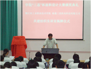 江西工業職業技術學院為了培養同學們的動手能力和實際操作能力鞏固所學的專業知識,為同學們將來在就業中分析和設計面料時提供一個練習的平臺,達到理論和實踐的結合。同時也讓還沒真正接觸專業課的同學學到面料分析的技術和方法拓展學生的知識面。為此,江西工業職業技術學院與南通三思機電科技有限公司聯合舉辦了“三思杯”紡織面料設計大賽,同學們表現出巨大熱情并積極踴躍參加。經組委會一個月辛勤勞動圓滿完成了各項工作,于11月03日在江西工業職業技術學院舉行了隆重的頒獎典禮。我公司總經理楊惠新應邀參加江西工業職業技術學院“三思杯”面料設計大賽頒獎典禮,并為部分獲獎同學頒獎。