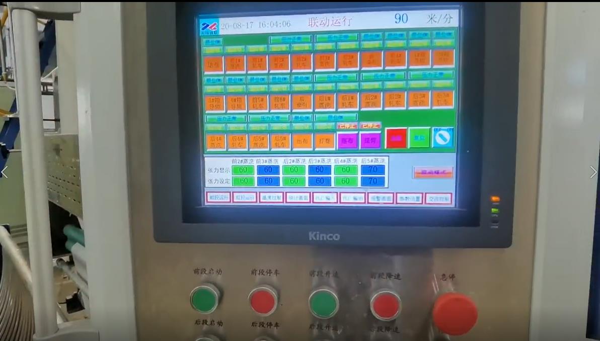 新型平幅前處理張力傳感器設(shè)備,今年無錫新聯(lián)印染機電有限公司為杭州中紡研發(fā)制造的新型平幅前處理設(shè)備——高速智能數(shù)控?zé)捚?lián)合機。創(chuàng)新的蒸洗箱無傳統(tǒng)松緊架結(jié)構(gòu),使用張力傳感器,并自助開發(fā)控制程序。做到?jīng)]有氣缸、沒有內(nèi)置軸承等機械結(jié)構(gòu),可減少維護保養(yǎng),減少故障率,設(shè)備運行張力參數(shù)可設(shè)定,并且實時顯示(高速運行及升降速過程張力跳動范圍控制在1KG以內(nèi)),用戶使用方便。目前設(shè)備已投入實際生產(chǎn)半年多,運行穩(wěn)定,獲得用戶好評。此外還裝備了新型雙層緊式汽蒸箱,極大程度提高了緊式汽蒸的容布量,汽蒸效果更好,同時也裝備了全自動補水系統(tǒng),清水補充了自動根據(jù)車速調(diào)整,實時顯示。目前用戶:杭州中紡、航民美時達、浙江錦森、浙江百麗恒、山東信諾