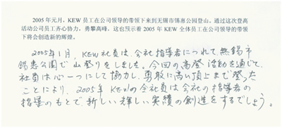 2005年元月,KEW員工在公司領導的帶領下來到無錫市錫惠公園登山。通過這次登高活動,公司員工齊心協力,勇攀高峰,這也預示著2005年KEW全體員工在公司領導的帶領下將會創造新的輝煌。