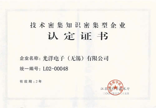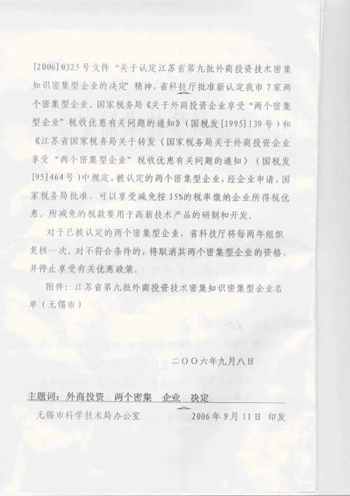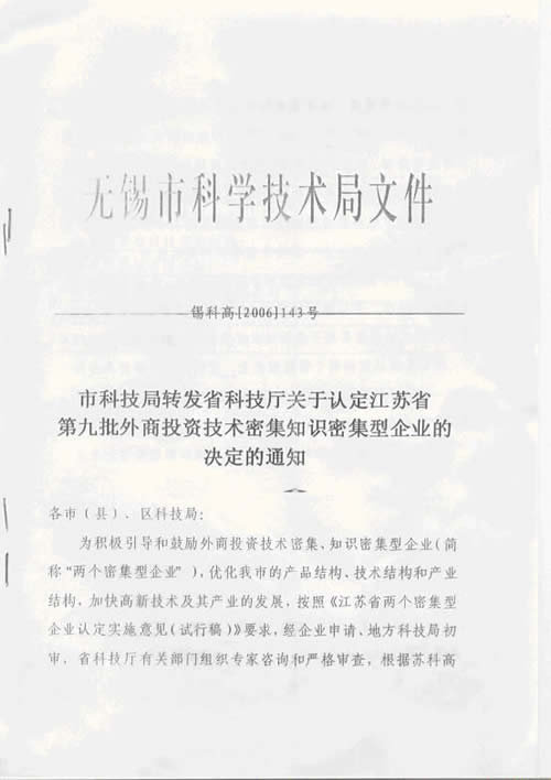 我公司繼獲得“江蘇省高新技術企業”、“江蘇省先進技術企業”這些榮譽后,又于2006年8月25日被江蘇省科學技術廳評為“江蘇省雙密集型企業”。