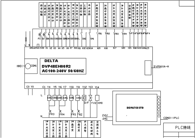 主控制器選用PLC,自動(dòng)化程度高,簡(jiǎn)化了線路。開(kāi)關(guān)量(包括啟動(dòng)停止按紐,限位,故障,頻率檢測(cè)等)輸入24點(diǎn);輸出10點(diǎn);模擬量檢測(cè)11路(壓力.溫度,水位);模擬量輸出2路.分別控制變頻器和比例閥,控制系統(tǒng)壓力和流量。主控制電路如圖2所示。