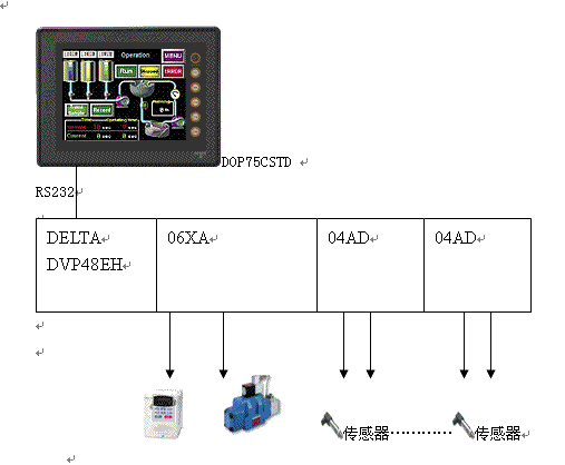 人機(jī)界面選取臺(tái)達(dá)7.5”彩色觸摸屏。人機(jī)界面(HMI)可顯示工藝流程、工藝參數(shù)和設(shè)備狀態(tài),HMI圖形接口友好,只需直接對(duì)圖示進(jìn)行手動(dòng)點(diǎn)觸操作,因此操作簡(jiǎn)便靈活。