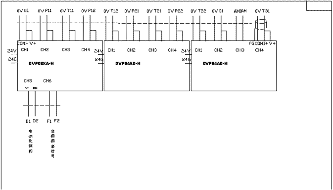 (3)擴(kuò)展單元設(shè)計(jì)。1個(gè)4通道AD輸入2通道AO輸出模擬量擴(kuò)展單元06XA-H,2個(gè)4通道AD模擬量擴(kuò)展單元04AD-H ,模擬量控制電路如圖5所示。