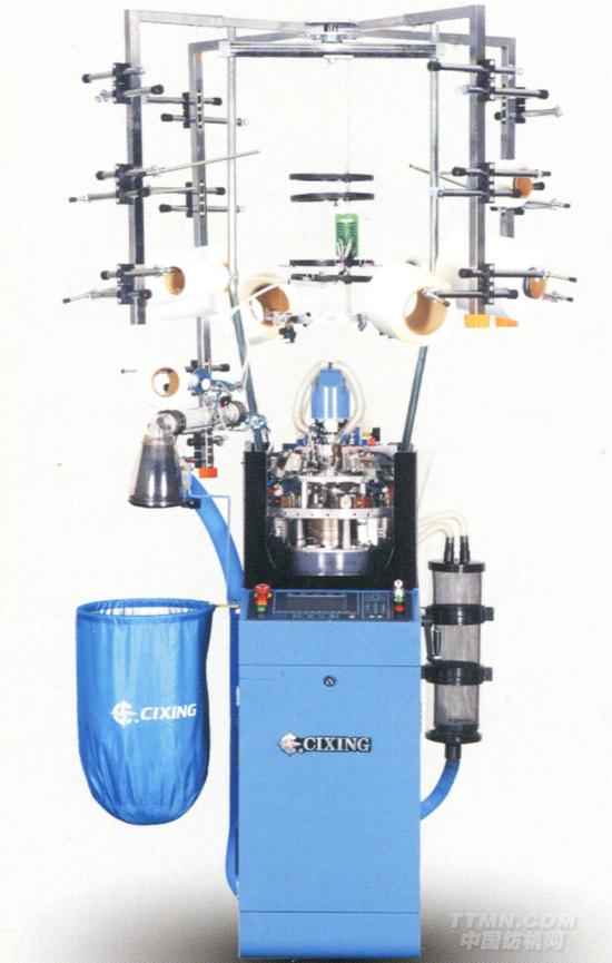 “慈星”牌GE04T型電腦高速絲襪機是由電腦控制的具有四路編織系統的單針筒提花絲襪機,該機采用獨立抽風機或中央抽風系統進行織物牽拉,并配備抗扭裝置,針筒轉動采用伺服電機直接驅動以減少傳動鏈的傳動誤差。生克三角的位置調節和針筒升降由步進電機控制,便于產生不同疏密織物。潤滑系統采用機械式供油,同步潤滑控制溫升。每路均配有橫移梭子,由雙氣動控制,改善織物翻紗現象。該機可使用合成纖維、人造纖維以及裸氨綸和包覆紗等原料生產絲襪產品,主要生產短襪、長筒襪、連褲襪等多種絲襪產品。