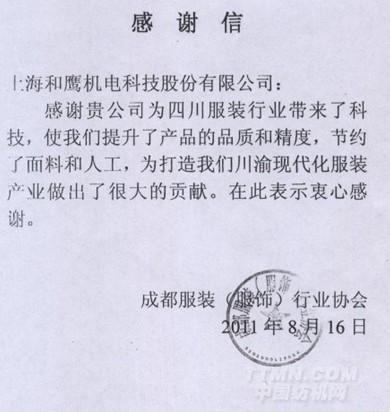 感謝貴公司為四川服裝行業(yè)帶來了科技,使我們提升了產(chǎn)品的品質(zhì)和精度,節(jié)約了面料和人工,為打造我們川渝現(xiàn)代化服裝產(chǎn)業(yè)做出了很大的貢獻(xiàn),在此表示衷心感謝。