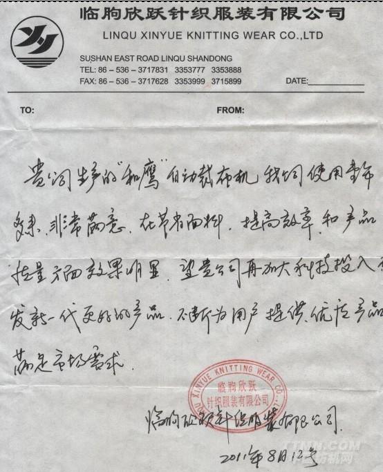 貴司生產(chǎn)的“和鷹”自動裁布機(jī),我司使用生產(chǎn)多年,非常滿意,在節(jié)省面料,提高效率,和產(chǎn)品的質(zhì)量方面效果明顯,望貴司再加大投入,研發(fā)新一代的更好的產(chǎn)品,不斷為用戶提供優(yōu)質(zhì)產(chǎn)品,滿足市場需求。