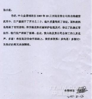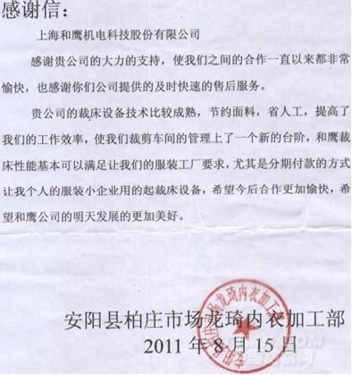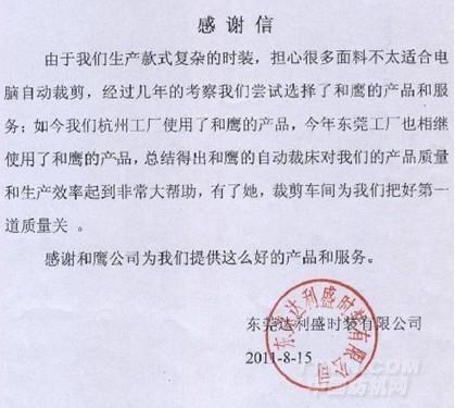 中山金萊制衣在2009年10月開始使用貴公司的自動裁剪機(jī)至今,日產(chǎn)量提升了百分之二十,裁片質(zhì)量得到了保證,面料損耗也得到了有效控制,售后根據(jù)和機(jī)械維護(hù)也能及時,保證了機(jī)器正常的運(yùn)作,我們生產(chǎn)得到了保障,在此,我向貴公司全體工作人員說聲,多謝!希在良好的合作基礎(chǔ)上,我們多聯(lián)系!多溝通!多探討!為美好的明天共創(chuàng)輝煌。