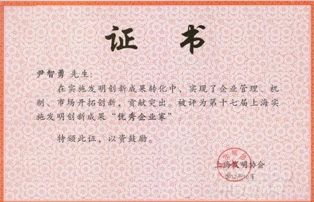 尹智勇董事長榮獲第十七屆上海市實施發(fā)明創(chuàng)新成果優(yōu)秀企業(yè)家獎