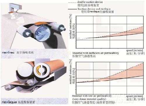 寇司德的高效軋水裝置(Nexaqua)純熟地運(yùn)用了其均勻輥技術(shù),與抽吸裝置組合,可極大地降低殘留水分,尤其適于高速生產(chǎn)的濕法工藝和水刺工藝。其與一般真空抽吸系統(tǒng)的脫水效果對比見圖 1。