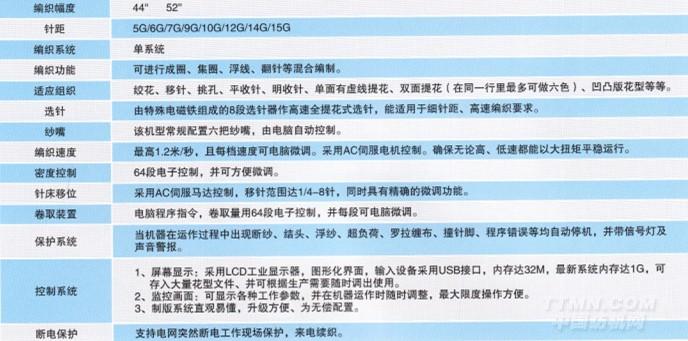 昌華針服公司擁有的CHJX-1-52-單系統電腦橫機采用單機頭、雙系統的編織系統,翻針三角復合式設計,二個系統皆可單獨或同時翻針,也可一系統翻針,另一系統編織。電腦控制界面采用LCD菜單形式,使得操作簡單易懂。S系列配置起底板功能,實現了單片布面自動起頭、自動結束的功能,讓布片的編織過程更加智能,有效地減少了編織廢紗,提高了生產效率。機型編織內容豐富,主要用于羊毛衫的自動編織,適用于絲、棉、毛、滌綸、混紡等原料,可編織雙面提花、單面提花、單面無虛線提花、挑洞、絞花等有規則或無規則花樣。