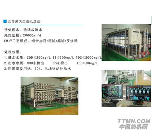 四大技術(shù)中與紡織企業(yè)密切相關(guān)的為膜分離環(huán)保集成技術(shù)(EMITM技術(shù))。EMITM技術(shù)包含前級(jí)處理、膜分離、濃縮水處理三級(jí)子系統(tǒng)。針對(duì)不同行業(yè)、不同類型、不同水質(zhì)、結(jié)合業(yè)主要求,運(yùn)用開(kāi)創(chuàng)開(kāi)發(fā)工程應(yīng)用經(jīng)驗(yàn)及最新實(shí)用專利技術(shù)的組合,實(shí)現(xiàn)投資(投資和運(yùn)行成本)最大效益化運(yùn)行模式,并達(dá)到節(jié)能減排(或零排放)的社會(huì)效益。