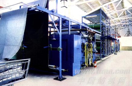 工藝流程:平幅進布、刷毛箱、二火口燒毛,三輥上漿,拉斜,三柱烘,給濕箱、橡毯預縮,呢毯烘干,落布。