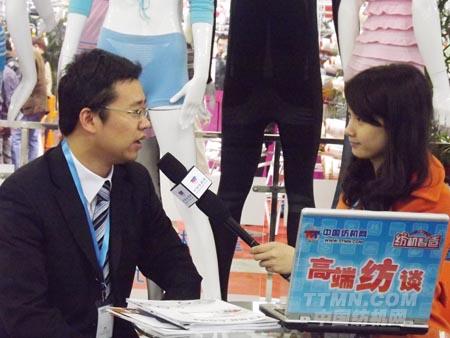 圖為寧波慈星展臺負(fù)責(zé)人在接受紡機網(wǎng)記者采訪