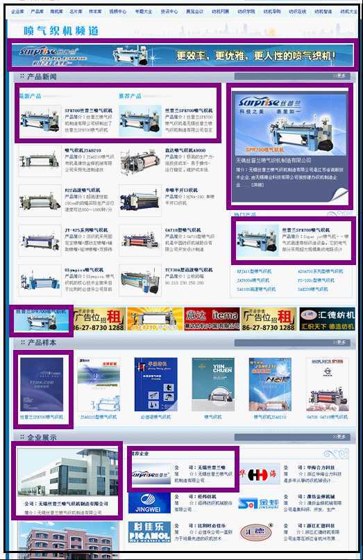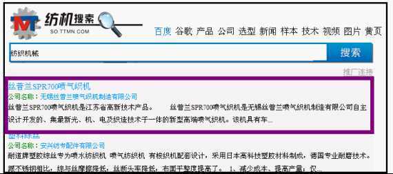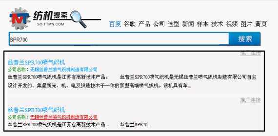 (5)紡機搜索“噴氣織機、織機、紡織機械、SPR700、織造機械、棉紡”等關鍵詞固定排名第一位或右側文字鏈接廣告