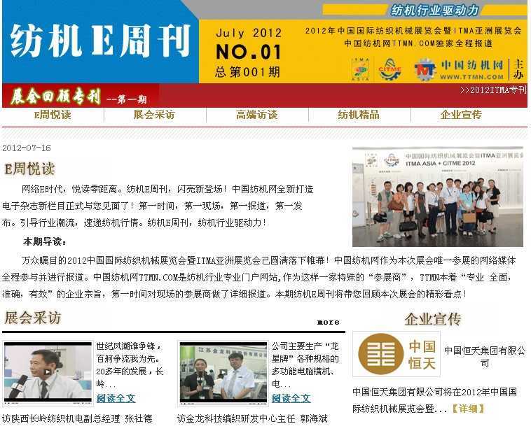 (1)綜合期刊——最新的企業(yè)新產(chǎn)品、報道紡機行業(yè)最新動態(tài),包括企業(yè)新聞、新產(chǎn)品展示、多媒體采訪報道等內(nèi)容,涉及范圍廣、涵蓋信息全、可讀性強