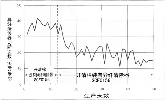 E、假如開清棉工序不安排從原棉中清除異纖的設備及人工揀異纖的工作;只有自動絡紗機上裝有清除異纖的電子清紗裝置。每100平方米機織布為31個染疵,每20公斤針織布里會有8個染疵。表明在清除異纖的環節中不設清除異纖的裝置,只有自動絡紗機上裝有清除異纖的電子清紗裝置是完全可以達到并低于市場對異纖染疵的允許數量的。但自動絡紗機的效率會因此而大為降低,效率只可有50%或以下。圖1