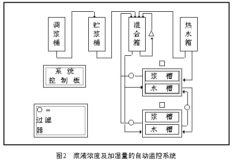 漿液濃度及預加濕自動監控系統如圖2,同時還要對熱水槽中的水量及水的溫度進行自動監控,實現了漿槽濃度與水槽溫度、水位高度的監控的完美結合,從而控制漿槽中含固量穩定一致,使漿槽漿液濃度穩定一致及預加濕量穩定一致。: